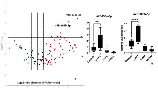 The expression profile of 84 miRNAs was performed in a discovery cohort consisting of 6 svPPA patients, 6 lvPPA, 6 nfv PPA and 6 healthy controls. The volcano plot showed a generalized upregulation of serum miRNAs in svPPA patients compared with healthy subjects (Figure 1A). The statistical analysis led to the identification of two significant upregulated miRNAs: miR-106b-5p (+7.5-fold regulation over controls, p = 0.0027) and hsa-miR-133a-3p (+22.5-fold regulation over controls, p = 0.000241). Upregulation of these two miRNAs were subsequently confirmed by Taqman qRT-PCR assays in a validation cohort composed of 12 svPPA, 12 lvPPA, 12 nfvPPA patients and 12 healthy controls, confirming previous data (miR-106b-5p: 2.69 ± 0.89 mean ± SD vs. 1.18 ± 0.28, p < 0.0001; miR-133a-3p: 2.09 ± 0.10 vs. 0.74 ± 0.11 mean ± SD, p = 0.0002, Figure 1B). No differences were observed stratifying data according to gender and age at onset.