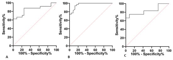 The receiver operating characteristic curve (ROC) results of serum miR-133a-3p together with miR-106b-5p. (A) AUC = 0.84, p < 0.001 svPPA vs. controls; (B) AUC = 0,95, p < 0.001 svPPA vs. lvPPA + nfvPPA0; (C) AUC = 0,83, p = 0.0056 AD-negative svPPA vs. AD-positive lvPPA + AD-positive nfvPPA.