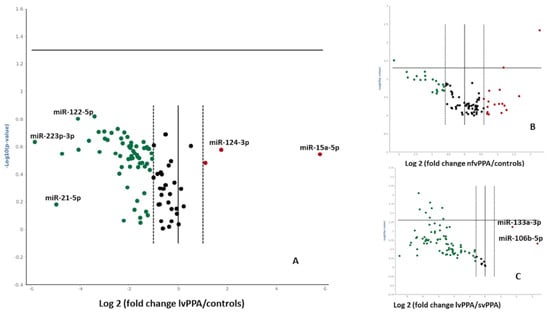 Volcano plots (A) lvPPA versus controls (B) nfvPPA versus controls (C) lvPPA versus svPPA. Data are expressed as Log 2 (fold change) and each dot represents one miRNA. Green indicates downregulation, red upregulation and black dots represent either miRNA that are below the fold change cutoff.