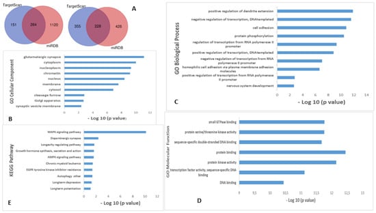 In order to gain an understanding of the potential biological significance of these miRNA deregulations, an in silico approach to identify potential target genes of miR-133a-3p and miR-106b-5p was used. Two publicly available bioinformatic tools were used: TargetScan 7.0 and miRDB. As shown in Figure 4A, a total number of 492 overlapping predicted target genes for these miRNAs were identified from these algorithms (Supplementary Tables S1 and S2). To understand the functional roles and mechanisms of identified target genes, GO and KEGG analyses were performed using DAVID (Frederick, MD, USA). The results demonstrated that genes were enriched in ten BP, such as, nervous system development and positive regulation of dendrite extension (Figure 4C), while for MF, the genes were enriched in small GTPase binding and in protein binding (Figure 4D). Additionally, CC analysis showed that the genes were enriched, among others, in nucleoplasm, cytoplasm and glutamatergic synapses (Figure 4B). The KEGG pathway analysis predicted that these mRNAs were mainly involved in a MAPK signaling pathway, dopaminergic synapsis and longevity regulating pathway (Figure 4E).