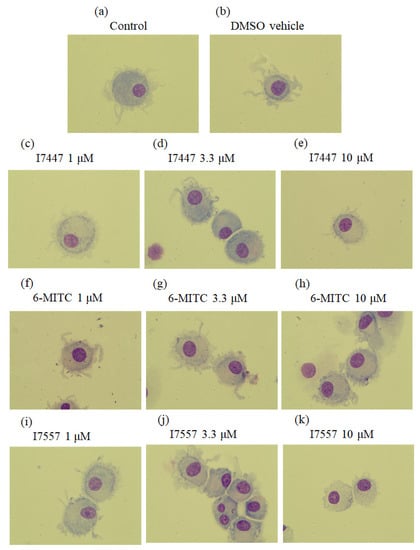 Morphological observation of dendritic cells. CD14+ monocytes were treated with (a) control; (b) vehicle control DMSO; (c–e) I7447; (f–h) 6-MITC; or (i–k) I7557 for 7 days to generate dendritic cells. Cells were stained by Liu’s method for morphological examination by light microscopy (magnification 1000×). As the concentration of 6-MITC, I7457, and I7557 increased, the dendrites of the cells were reduced and shorter.