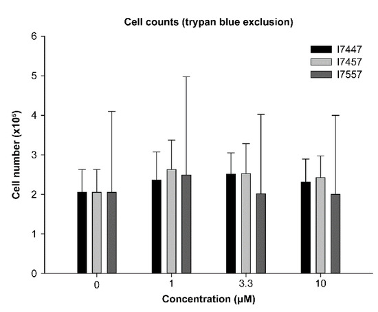 6-MITC, I7447, and I7557 did not significantly affect the viability of dendritic cells at 1, 3.3, and 10 μM.
