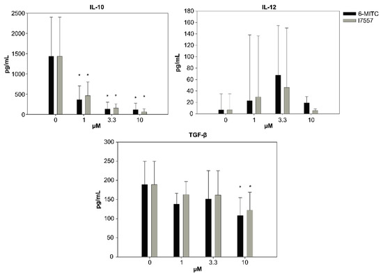 The secretion of IL-10 and TGF-β was inhibited by 6-MITC and I7557 in a dose-dependent manner. * p < 0.05 in comparison to control.