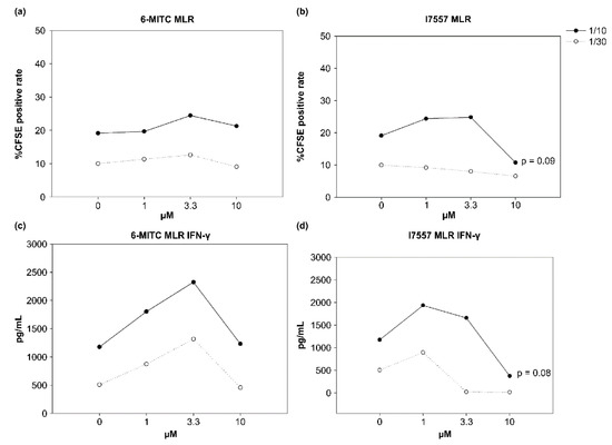 The 6-MITC showed no significant effects on allogeneic CD4+CD45RA+ T cells, whereas I7557 had dual effects on the T cells. The low-concentration-treated DCs stimulated the proliferation of allogeneic CD4+CD45RA+ T cells, whereas the DCs treated with high-doses tended to inhibit the naïve T-cell proliferation (Figure 5). Interferon (IFN)-γ production by these allogeneic naive T cells exhibited a similar curve to that of the T-cell proliferation for the I7557-treated group.