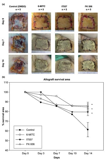 (a) 6-MITC and I7557 maintains skin allograft integrity; (b) 6-MITC and I7557 prolongs skin allograft survival by maintaining the survival area (* p < 0.05).