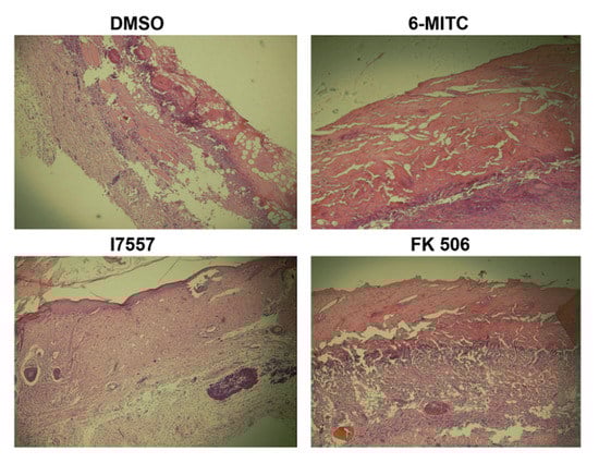 By day 14, the skin allografts in the dimethyl sulfoxide (DMSO) control group exhibited severe epidermal necrosis and necrotizing vasculitis. The treatment with 5.0 mg/kg 6-MITC or I7557 markedly reduced the inflammatory reaction and showed improved integrity of the epidermis and reduced inflammatory cell infiltration, compared with the DMSO vehicle controls (Figure 7). The positive control, FK-506 (3.0 mg/kg), also showed a superior effect at maintaining epidermal integrity and reducing graft inflammation.