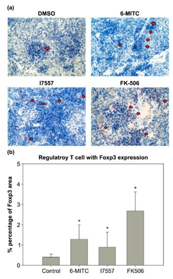 Comparison of spleen tissue histology. The spleen tissue sections were stained for Foxp3 immunohistochemically after treatment with 5 mg/kg 6-MITC, I7557 5, and 3 mg/kg FK-506 compared with the controls. The I7557- and 6-MITC-treated groups exhibited higher regulatory T-cell expression compared with the control group. Arrowheads indicate Foxp3+ cells. (a,b) In 6-MITC and I7557-treated groups, more Foxp3-expressing Treg cells were accumulated in the spleen * p < 0.05 compared with the control group (unpaired Student t-test). Magnification 400×.