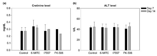 After skin transplantation, there were no significant differences between the control, 6-MITC, I7557, and FK506-treated rats in either the ALT or creatinine levels (Figure 9).