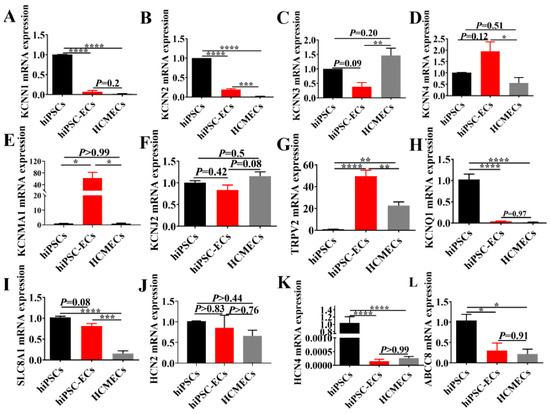 MRNA expression level of ion channels in hiPSCs, hiPSC-ECs and HCMECs. All the data are normalized to that of hiPSC values (A–L). Transcriptional levels of small conductance calcium-activated potassium channel four isoforms, including SK1 ((A), n = 3), SK2 ((B), n = 3), SK3 ((C), n = 3), SK4 ((D), n = 3), large conductance calcium-activated potassium channel (BK, (E), n = 3), inwardly rectifying potassium channel Kir2.1 (KCNJ2, (F), n = 4), transient receptor potential vanilloid 2 (TRPV2, (G), n = 4), slowly activated delayed rectifier potassium channel (IKs, (H), n = 4), Na/Ca exchanger ((I), n = 3), hyperpolarization-activated cyclic nucleotide-gated channels (HCN2, (J), n = 3, and HCN4, (K), n = 4) as well as ATP-sensitive potassium channel (KATP, (L), n = 3) were examined by qPCR. The results are presented as mean ± SEM, * p < 0.05, ** p < 0.005, *** p < 0.0005, **** p < 0.00005.