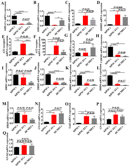 Additionally, we evaluated the expression of adrenergic, muscarinic, dopamine, angiotensin II receptors and G proteins. The expressions of α-adrenoceptors ADRA1A and ADRA2A in hiPSC-ECs and HCMECs were lower than those in hiPSCs (Figure 3A,B), while transcripts of β-adrenoceptors (ADRB1 and ADRB2) in hiPSC-ECs and HCMECs were highly expressed compared with hiPSCs, and there was no significant statistic difference between hiPSCs and hiPSC-ECs (Figure 3C,D). The expression level of muscarinic receptor, M3 (CHRM3), but not M2 (CHRM2), in the hiPSC-ECs and HCMECs was lower than that in hiPSC, and no significant difference between hiPSC-ECs and HCMECs was detected (Figure 3G,H). The gene expression of dopamine receptors, such as DRD1, DRD2, DRD3, DRD4 and DRD5 were detected (Figure 3I–M). The expression of DRD1–5 in hiPSC-ECs and HCMECs was lower than that of hiPSC, but no significant difference was observed between hiPSC-ECs and HCMECs. Next, the gene changes in angiotensin II receptors AT1 and AT2 were observed (Figure 3E,F), and, in particular, a higher expression level of AT1 was found in hiPSC-ECs (Figure 3F). Besides, the mRNA expression of G-proteins, e.g., Gs (GNAS), Gi (GNAI2), and Gq (GNA11 and GNAQ), were also measured, showing that the G proteins were almost equally expressed in hiPSC-ECs and HCMECs (Figure 3N–Q).
