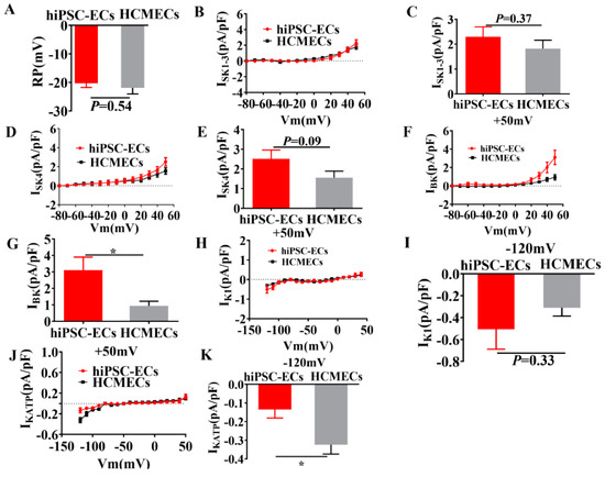 Membrane potential and ion channel currents in hiPSC-ECs and HCMECs. Membrane potential and ion channel currents were recorded by the whole cell patch clamp technique. Intracellular and extracellular solutions or specific blockers were applied to confirm the identity of expected currents. (A) Mean values of resting potential (RP) in hiPSC-ECs and HCMECs, n = 10 cells/group. (B) Apamin-sensitive SK1–3 current (ISK1–3) density from −80 mV to +50 mV in hiPSC-ECs and HCMECs. (C) The mean data of ISK1–3 at +50 mV. n = 10 cells/group. (D) Tram-34-sensitive current (ISK4) densities from −80 mV to +50 mV in hiPSC-ECs and HCMECs. (E) ISK4 density at +50 mV in hiPSC-ECs and HCMECs. n = 10 cells/group. (F) Iberitoxin sensitive BK currents at different potentials in hiPSC-ECs and HCMECs. (G) BK current density at +50 mV in hiPSC-ECs and HCMECs. n = 10 cells/group, * p < 0.05. (H) IK1 current density from −120 mV to +50 mV in hiPSC-ECs and HCMECs. (I) IK1 at −120 mV in hiPSC-ECs and HCMECs. n = 10 cells/group. (J) IKATP current density in hiPSC-ECs and HCMECs from −120 mV to +50 mV. (K) Current density of IKATP at −120 mV in hiPSC-ECs and HCMECs. n = 10 cells/group, * p < 0.05.