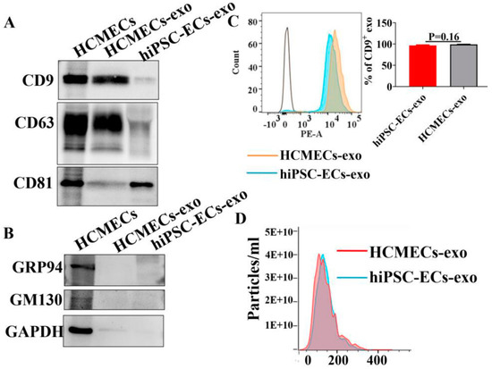 Characterization of the purified exosomes from hiPSC-EC and HCMEC conditioned media. Exosomes isolated from cell culture media of hiPSC-ECs and HCMECs. (A) Western blot showed the detection of exosome markers CD9, CD63, and CD81 in isolated exosomes. (B) Glucose-regulated protein 94 (GRP94) and Golgi marker GM130 were not found in exosomes. (C) Flow cytometry analysis using exosome marker CD9. (D) The size distribution of isolated exosomes was measured by nanoparticle tracking analysis (NTA) in hiPSC-ECs and HCMECs.