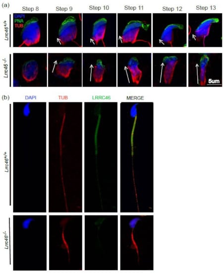 Yin, Y.; Mu, W.; Yu, X.; Wang, Z.; Xu, K.; Wu, X.; Cai, Y.; Zhang, M.; Lu, G.; Chan, W.-Y.; et al. LRRC46 Accumulates at the Midpiece of Sperm Flagella and Is Essential for Spermiogenesis and Male Fertility in Mouse. Int. J. Mol. Sci. 2022, 23, 8525. https://doi.org/10.3390/ijms23158525