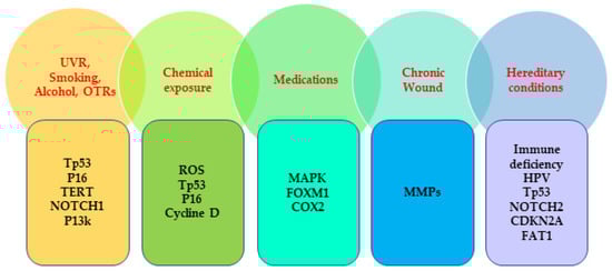 SCC is commonly known as one of the human cancers that result from the increased accumulation of genetic mutations caused by various carcinogens. Recent studies have demonstrated the commonly mutated genes from different pathways known as cell cycle regulators, keratinocyte differentiation, NOTCH-signaling pathways, tumor suppressor pathways, mitogenic/survival-signaling pathways, cyclooxygenase pathways, Hippo-signaling pathways, etc. (Figure 1).