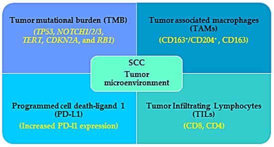 Understanding of the TME landscape and the immune regulation is absolutely essential for the development and better outcome of therapies. The TME in SCC is composed of a stromal component with cancer-associated epithelial, endothelial cells and fibroblasts, melanocytes, vascular cells, infiltrating immune cells ((T cells, B cells, natural killer cells, dendritic cells, tumor-associated macrophages (TAMs) myeloid-derived suppressor cells, and tumor-infiltrating lymphocytes (TILs); CD4, CD8, regulatory T cell), and non-cell components of extracellular matrix composed of proteins; fibronectin, collagen, glycoprotein, MMPs, laminins, tenascin, gelatin and syndecan, vitronectin, growth factors (EGF, fibroblast growth factor (FGF, hepatocyte growth factor, vascular endothelial growth factor (VEGF)), cytokines (TNF- α; tumor necrosis factor-α, interleukins (ILs) and chemokines; C-X-C motif chemokine ligands (CXCLs; CXCL,1,8,12,14 and C-C motif chemokine ligands (CCLs; CCL2,5,7) [108,109,110].
