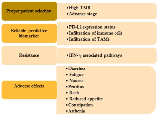 The immune-related adverse events (irAEs) are another challenge that is sometimes observed in the immunotherapy-treated patients and the occurrences of these irAEs are often dependent on the extrinsic factors, for example, type and the dose of the therapy, duration of treatment, or in the intrinsic factors such as prior auto-immune diseases, or other hereditary conditions, patients’ immune system in the TME, etc. [141]. Diarrhea, fatigue, nausea, pruritus, rash, reduced appetite, constipation, and asthenia are the most commonly observed adverse effects seen in the patients treated with FDA approved PD-antibodies cemiplimab, nivolumab, and pembrolizumab.