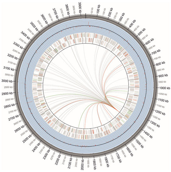 - Krzywinski, M.; Schein, J.; Birol, I.; Connors, J.; Gascoyne, R.; Horsman, D.; Jones, S.J.; Marra, M.A. Circos: An information aesthetic for comparative genomics. Genome Res. 2009, 19, 1639–1645. [Google Scholar] [CrossRef] [PubMed]