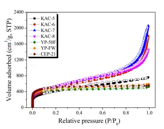 The isothermal adsorption–desorption curve is the most effective method for analyzing the characteristics of porous carbon materials. The isothermal adsorption–desorption curves and textural properties for activated carbons (KAC and commercial activated carbons) are given in