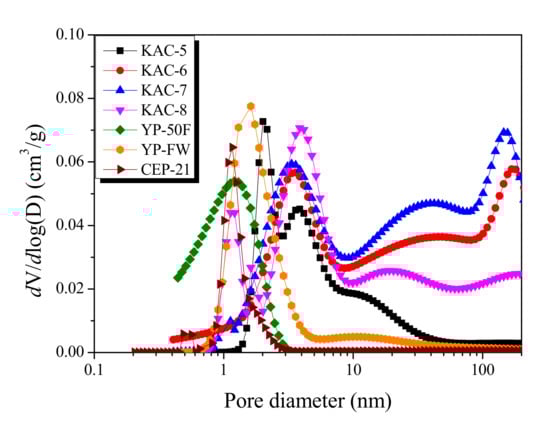 Figure 2. First, compared to KAC, commercial activated carbons present narrower and smaller pore diameters on the pore-distribution curves. CEP-21, YP-50F, and YP-FW each show a curve with main pore diameters of 1.14 nm, 1.2 nm, and 1.66 nm, respectively. CEP-21, in particular, as it is formed through KOH activation, displays the narrowest pore distribution curve with the smallest pore diameter. Although YP-50F and CEP-21 have a microporous structure with pore distribution curve of <3 nm pore diameter, the mesoporous structure was most distinct for YP-FW among the commercial activated carbons with the pore growth of up to a 100-nm pore diameter.
