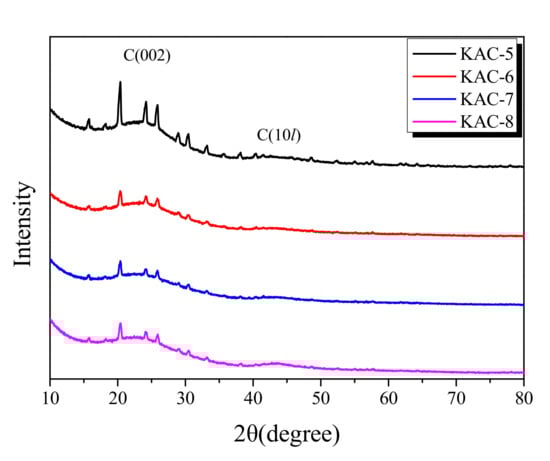 29]. The activation of KAC was mediated without carbonization after stabilization at 200 °C. Thus, the crystal growth is presumed to have occurred as the temperature increased in the activation process. As the XRD shows the mean values after statistical analyses, the oxidation of non-crystalline parts is observed with a relative increase in crystal growth [