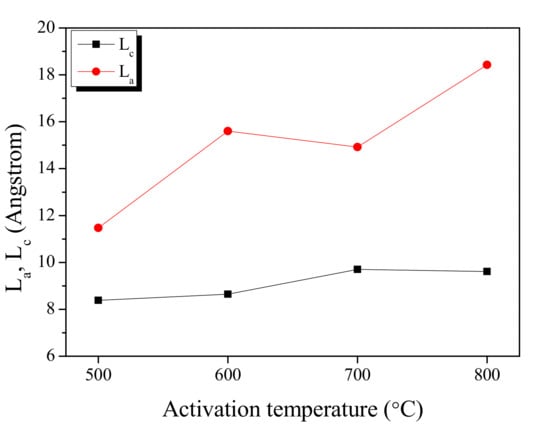 Table 1, an increase in the activation temperature caused an increase in the specific surface area; this means that with the increase in activation temperature, the oxidation of non-crystalline parts increased to form micropores. As a result, the L