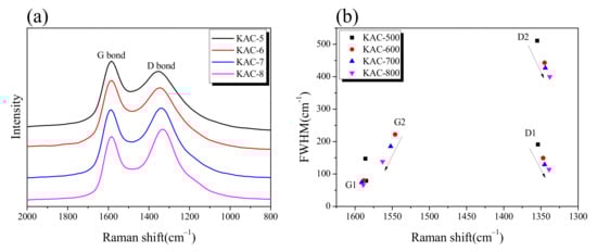 31]. With an increase in activation temperature, a negligible change was observed in G1 across all KAC samples, whereas the FWHM decreased in G2, D2, and D1. Phosphate activation has a pore-development mechanism similar to that of physical activation in which crystal edges are oxidized by oxygen generated by the decomposition of phosphate linkages [