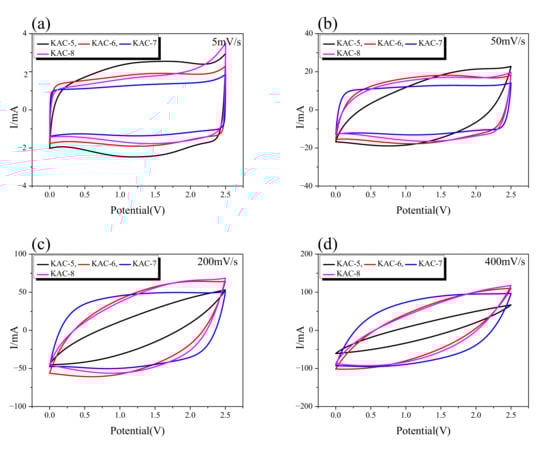Figure 6a, the CV curves of all KAC was observed in a rectangular form due to low ion-diffusion resistance at the slowest charge–discharge rate of 5 mV/s. The CV curve area was also highly similar across all KAC types. Thus, at slow charge–discharge rates, all KAC are presumed to have a highly similar specific capacitance.