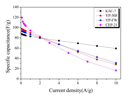 32]. Thus, as KAC-7 has the highest mesopore volume, the reduction rate of the specific capacitance is presumed to be the lowest despite the high current density.