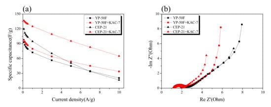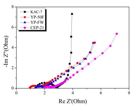 Figure 9b, the Nyquist plot showed an improvement in impedance after the blending of KAC with commercial activated carbons. No significant change was observed for the semi-circle of commercial activated carbons even after the blending with KAC, but the Warburg impedance was greatly improved. The KAC was thus found to have a positive effect on greatly enhancing the original EDLC performance through the blending with commercial activated carbons with a microporous structure, although it may also serve independently as an active electrode material in EDLC for high power density.