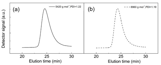 GPC analysis of the CI-PPEMA of various molecular weights (a) for 5420 g mol−1 and (b) for 8960 g mol−1.