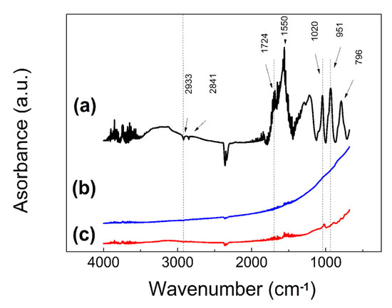 The presence of the grafted polymer on the surface of CI was confirmed by FTIR (Figure 3). As can be seen in Figure 3a, the typical C-H absorption bands are visible at 2993 cm−1 and 2841 cm−1. Furthermore, presence of carbonyl from methacrylate is visible for C=O stretching vibration at 1724 cm−1. Successful synthesis of PPEMA is also confirmed by peak at 1550 cm−1 as new absorption band of C-N. C-H vibrations are present at 1020 cm−1. The oxidized form of the PPy moiety is clearly seen at 951 cm−1, which is typical for certain doping state [31]. In case of CI-PPEMA composite particles, the most visible peaks corresponding to the carbonyl 1724 cm−1, to the C-H at 1050 cm−1 and finally to the oxidized form of PPy moiety present on the surface of the particles.