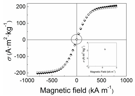 Magnetization curves of the bare CI (◆) and CI-PPEMA (▷) particles. The circle in the middle of the figure represents the figure inset position.