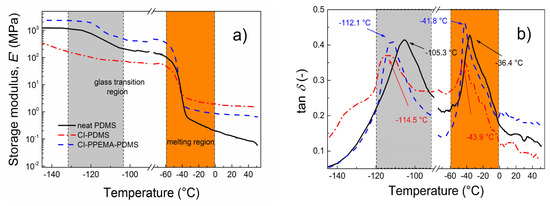 As can be seen in Figure 6, the investigated samples exhibited temperature-dependent behavior typical for PDMS-based elastomers [38]. At low temperatures, below Tg, the highest E′ was obtained for the SE containing CI-PPEMA particles (Figure 6a), which were well-dispersed in the PDMS matrix due to modification with a polymer shell using the ATRP approach, similarly to what was observed for other elastomeric systems with short polymer brushes [39,40]. On the other hand, the SE containing bare CI particles possessed the lowest E′, indicating the presence of agglomerates and thus the significant disintegration of this sample, which was pronounced at lower temperatures. Above Tg, however, the situation was completely different. Around −40 °C, melting of the PDMS crystalline phase occurred (Figure 6), then at higher temperatures bare CI particles in the form of agglomerates possessed a strong reinforcing effect due to their possible covalent bonding with the PDMS matrix, which significantly enhanced the mechanical properties of the composite [41]. On the contrary, the SE containing CI-PPEMA particles exhibited, above the melting region, higher E′ values than the neat PDMS, but lower ones when compared to that of the SE containing bare CI. The results suggest that the mechanical properties of studied materials are strongly related to the crystalline phase of the PDMS matrix. Thus, the neat PDMS without any reinforcing agents (bare CI or CI-PPEMA) exhibited the lowest mechanical performance when the whole crystalline phase was melted. This is a crucial phenomenon, very frequently discussed for crystalline thermoplastic polymers such as poly(ethylene) [42], poly(propylene) [43] or poly(vinylidene fluoride) [44]; however, it is firstly addressed for PDMS elastomer in this article and taking into account that a potential applicability of such SE can be above the melting region.