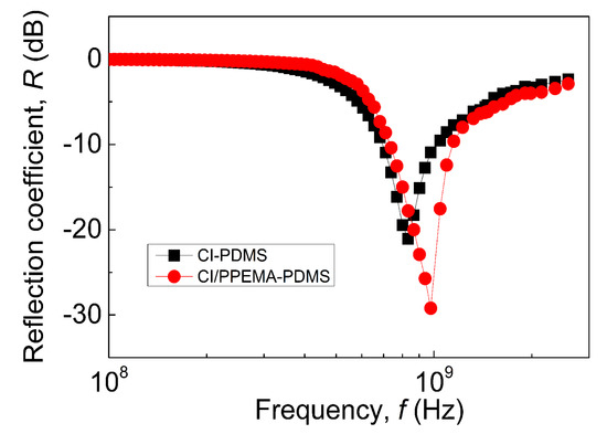 As can be seen from Figure 7, SEs exhibit good absorbing ability at ultra-high frequencies with bandwidths ranging from 1.15 to 1.44 GHz and a maximum value of reflection coefficient of nearly 30 dB for CI-PPEMA-based PDMS composite with a sample thickness of 500 μm. In this case, we are assuming a single-layer metal-backed absorber model (Equation (1)), i.e., the reflection of the acting wave. Moreover, the electromagnetic shielding materials based on CI-PPEMA particles have different operating frequency ranges comparing to SE based on pristine CI particles. Thus, it is possible through the modification of the particle surface and thereby affecting the frequency characteristics of permeability and permittivity of MREs to tune the operating frequency range of SE, making possible their application in the frequency range from nearly 700 MHz to 1.6 GHz, in which many communication and information transmission systems usually operate [9]. The values presented in this study are very promising and still competitive to the state of the art as reported by Anju et al. combining magnetic nanoparticles, reduced graphene oxide in TPU matrix with shielding efficiency on transmission of 58.8 dB for a sample thickness 1 mm [45]. Utilization of the magnetite particles with reduced graphene oxide provides the reflection of 25 dB with a sample thickness of 1 mm [46]. Moreover, the application of the nanoscale iron/iron-carbide graphite particles in the PVDF matrix significantly improve the EMI shielding, reaching a reflection coefficient of 40.5 dB for a 4.3 mm-thick specimen. Another set of already published systems are summarized in Table 1. Our designed system has significant benefit in the core-shell particle system, when the core is magnetic and the shell is electrically conductive and covalently bonded to the core. Therefore, the processing of our hybrid particles is advantageous since the distribution of the magnetic and electrically conducting particles is homogenous. In the case of utilization of individual graphene oxide particles, they could even be reduced, as such homogenous distribution is always a problem and was not considered in the mentioned studies.