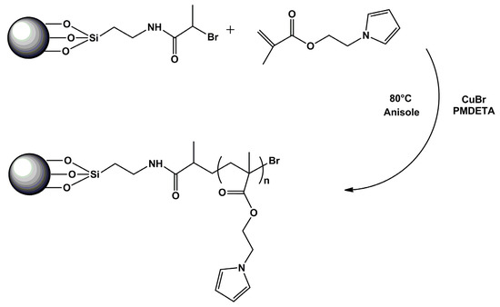 Schematic illustration of the SI-ATRP of the poly(1-H-pyrrole-1-yl)ethyl methacrylate (PPEMA) from the CI particles.