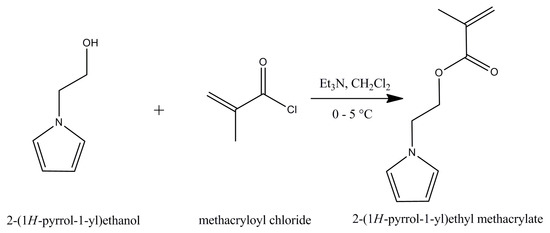 The process is a two-step synthesis; firstly, freshly distilled pyrrole reacts with 2-chloroethanol. The synthesis was performed as follows: a magnetic stirrer and KOH were evacuated for 30 min in a three-neck flask and backfilled with argon. Dried DMSO (100 mL) was added under argon atmosphere. Freshly distilled pyrrole (4 mL) was bubbled with argon for 15 min and added to the mixture. Finally, 2-chloroethanol (1.6 g) bubbled for 30 min with argon was added dropwise at velocity of 4 mL/hour. The reaction was carried out for 12 h at ambient temperature. The mixture was extracted with dichloromethane and brine 3 times and dried over sodium sulfate. Then, the column extraction was performed with eluent isohexane:ethyl acetate in a ratio of 3:2, then again column extraction in isohexane:ethyl acetate in ratio 2:1 and pure product, 2-(1H-pyrrole-1-yl)ethanol (HEP) (yellowish liquid) after evaporation of the solvent excess using vacuum rotator. The yield of this reaction was calculated as 75%. The product was dissolved in CDCl3 and characterized using nuclear magnetic resonance (NMR) 1H NMR (CDCl3): δ 6.70 (dd, C4H4N), 6.18 (dd, C4H4N), 4.07 (t, NCH2CH2), 3.84 (t, HOCH2CH2), 1.75 (s, COH).