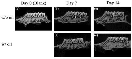 Micro CT images showing bone loss measurements for each group at Day 0 (a), Day 7 (b,d) and Day 14 (c,e). On the sagittal side, radiographic bone loss was detected from CEJ to ABC (white arrow). The bone loss for SM oil samples (b,c) were lower than the oil-free groups (d,e).