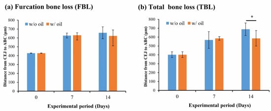 Figure 2 shows total bone loss (TBL) and furcation bone loss (FBL). These figures show that the change in furcation bone loss level showed no significant difference during the entire experimental period (p = 0.891 and 0.284 for Day 7 and Day 14, respectively) (Figure 2a). Nevertheless, a significant difference for TBL was seen in CEJ-ABC distances between sample teeth ligated with and without SM oil on Day 14 (p < 0.05) (Figure 2b).