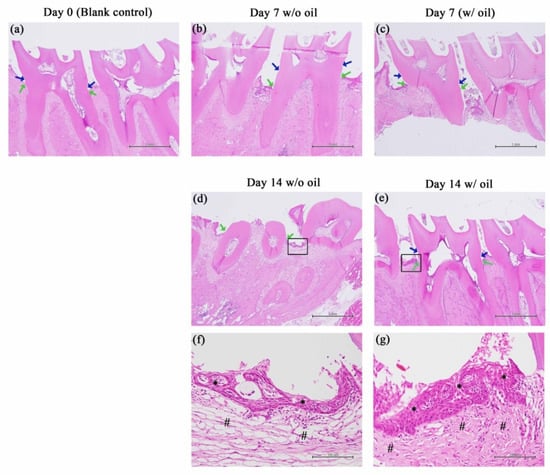 Histological results of tested molars at Day 0 (a), Day 7 (b,c) and Day 14 (d,e) with a magnification of 40×. Images of bone-surrounding tissue interface (black box) of oil-treated (d) and oil-free (e) samples on Day14 were enhanced by higher magnification micrographs of 400× (f,g, respectively). Blue arrows indicate cemento-enamel junction (CEJ). Green arrows indicate the most coronal level of the alveolar bone crest (ABC). * and # signs identify the epithelium and lamina propria, respectively. Scale bar is 1 mm for (a–c), and 100 μm for (f,g).