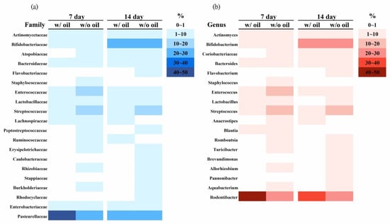 Heatmaps from microbiota analysis of samples treated with or without SM oil at (a) family and (b) genus levels during the experimental period. Values are presented in percentages.