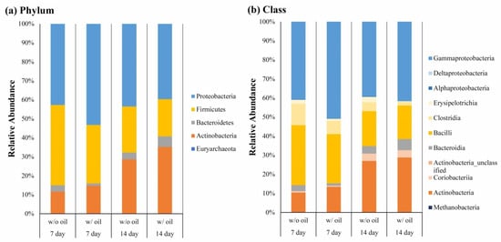 Relative abundance of bacteria in (a) phylum and (b) class levels on Day 7 and Day 14, when the tested teeth were treated with and without SM oil.