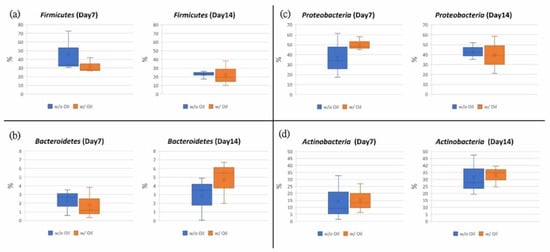 Tested teeth were subjected to ligature-induced periodontitis. Data from samples treated with and without SM oil were compared. Sub-figures show box plot analysis in the phylum of (a) Firmicutes, (b) Bacteroidetes, (c) Proteobacteria and (d) Actinobacteria.