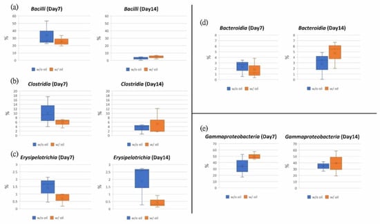 Tested teeth were subjected to ligature-induced periodontitis. Data from samples treated with and without SM oil were compared. Sub-figures showed the box plot analysis in the class of (a) Bacilli, (b) Clostridia, (c) Erysipelotrichia, (d) Bacteroidia and (e) Gammaproteobacteria.
