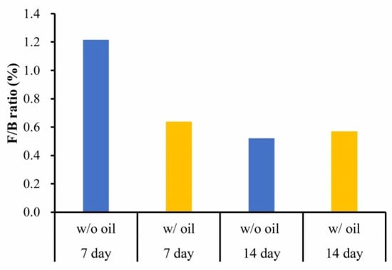 Firmicutes/Bacteroidetes (F/B) ratio from the median on Day 7 and Day 14 between samples treated with and without SM oil.