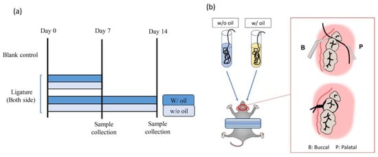 (a) Ligature-induced periodontitis experimental design with sacrifice time points. Blank control was the ligature-free samples at Day 0. In the ligature group, the second left molar was ligated with silk pre-immersed with SM oil (w/ oil). The corresponding tooth on the right side was tied with silk-free of SM oil (w/o oil) on Day 0. Rats were euthanized after 7 and 14 days. (b) Detailed procedures and preparation of the periodontitis animals were ligated with 3-0 silk around the cervical of the second molar of maxillary bone.