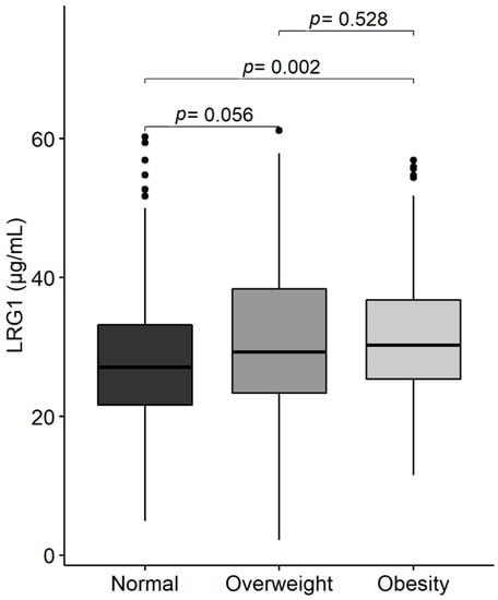 Obesity is a major health challenge that contributes to the development of diabetes and cardiovascular diseases. It has been reported that elevated levels of LRG1 were observed in young diabetic and obese adults compared to healthy adolescents and non-obese adults [,]. Therefore, it was crucial to investigate the association between LRG1 and several obesity markers and to compare LRG1 levels between obese, overweight, and normal-weight adolescents. In this report, we investigated the association between LRG1 and childhood obesity. Additionally, we assessed the association between LRG1 and several obesity markers, including HsCRP, chemerin, and leptin.