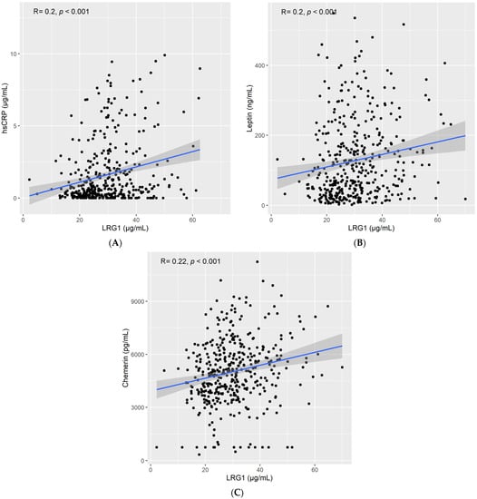 Correlation between LRG1 and (A) high sensitivity C-reactive protein (hsCRP), (B) leptin, and (C) chemerin.