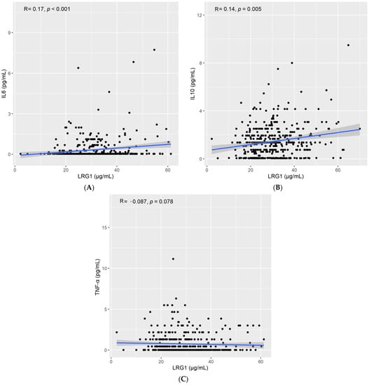 Correlation between LRG1 and (A) IL6, (B) IL10, and (C) TNF-α.