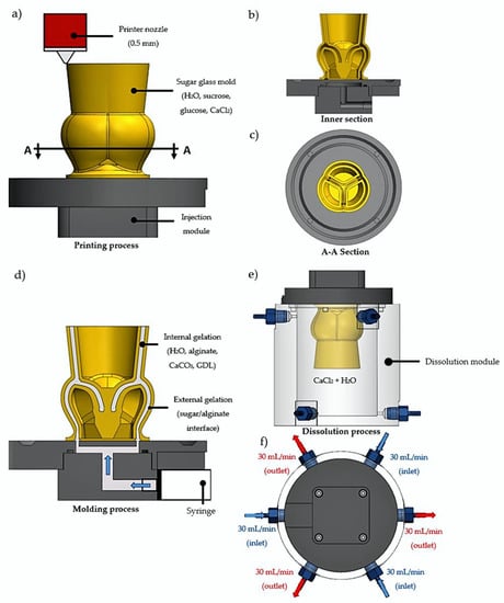 Schematic of the aortic valve scaffold fabrication. (a) Aortic valve sugar glass mold loaded with CaCl2 and printed with a 0.5 mm custom printer nozzle and a 0.2 mm layer height. (b) Inner section of the mold. (c) A-A section of the mold showing the interior at the mid-sinus. (d) Molding process of the aortic valve scaffold using the syringe loaded with the sodium-alginate formulation containing the sodium alginate loaded with GDL and CaCO3 for internal gelation. External gelation occurred at the sugar/alginate interface. (e) Transferring the mold injected with the sodium-alginate solution into the dissolution module. (f) For the dissolution of the sugar mold, a 90 mL/min total (inlet/outlet) flow of water supplemented with CaCl2 was performed.