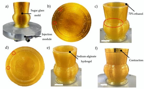 A sodium-alginate hydrogel solution supplemented with CaCO3 + GDL gelation agents was used for casting of the scaffolds. CaCO3 has very low solubility in distilled water, which allows its uniform distribution throughout the scaffold. GDL was used to initiate the gelation by dissociating CaCO3 into Ca2+ ions, which crosslinked the alginate (internal gelation) and formed a hydrogel. The gelation time was controlled by adjusting the concentrations of CaCO3 and GDL and was selected to allow enough time for the hydrogel formulation to be molded before gelation occurred. The molds were filled with the freshly made hydrogel formulation by the bottom, using the injection module (Figure 1d). The low-viscosity alginate used was essential to fill the molds completely and prevent bubbles from being trapped in the hydrogel. Filling the molds from below (Figure 2d) also helped to prevent the trapping of air bubbles during gelation of the hydrogel. Any remaining sugar filaments from the mold were easily dissolved by the highly aqueous hydrogel formulation. The latter would also normally dissolve the highly soluble sugar glass molds. However, a few seconds after the injection, the fast dissolution of the molds at the alginate-sugar interface released calcium ions from the sugar molds, which crosslinked with the sodium alginate (external gelation) to form a membrane at the interface that effectively stopped the dissolution of the molds by the hydrogel formulation (Figure 1d and Figure 2e,f). After 7 min of gelation, there was very little dissolution of the sugar glass molds (Figure 2f). Visually, the scaffold contracted by the amount shown in Figure 2f (dotted line).